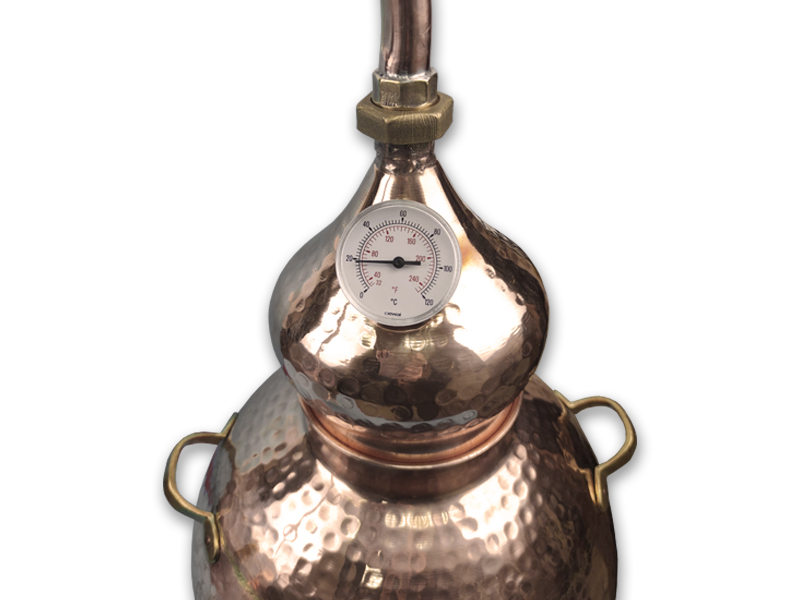 Купити в кредитАламбік 40 л (AL40T). Мідний дистилятор об`ємом 40 л із зварними стиками. Складається аламбік на 40 л з чотирьох частин, власне з перегінного куба з об`ємом 40 л, клепанними сполуками та біологічним ущільненням, шолом у вигляді цибулини, паровідвідна трубка та радіатора з вбудованою охолоджувальною спіраллю та води для циркуляції. . Місткий сорокалітровий перегонний куб міцно з`єднується зі змійовиком радіатора, "лебединою шиєю", як називається трубка спиртопровід. Охолоджувач обладнаний штуцерами, який забезпечує якісну герметизацію ємності, а також підведення холодної води та її стік. Самогону установку можна використовувати на природі, використовуючи для нагрівання дрова. Матеріал з якого виготовлено Аламбік 40 л: кована сталь. Застосування Аламбіка: дистиляція бренді з вина та пива, дистиляція власної браги та сусла, дистиляція на вечірках, презентації, декорування, проста дистиляція ефірних олій, гідролатів та дистильованої води.