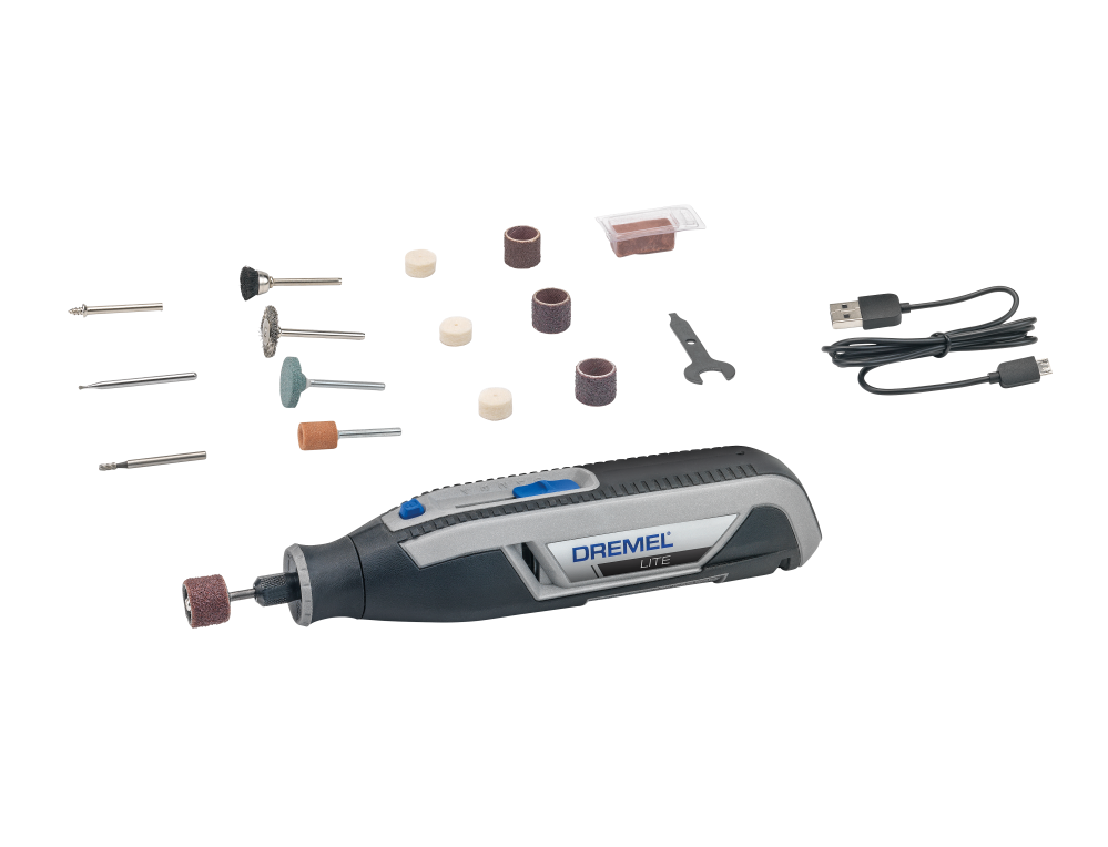 • Інструмент має у своєму арсеналі бездротовий інструмент Dremel Lite із зарядкою через USB, завдяки чому можна приступити до наступного проекту у будь-який час та в будь-якому місці;