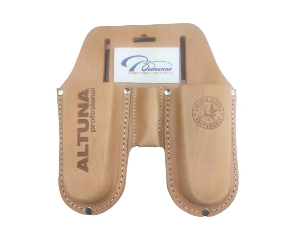 Купити в кредитШкіряний чохол ALTUNA 97005A (кобура) має 2 відсіка для секатора/ножиць/розкладної пилки та додатково відсік для прививочного ножа або заточного камінця