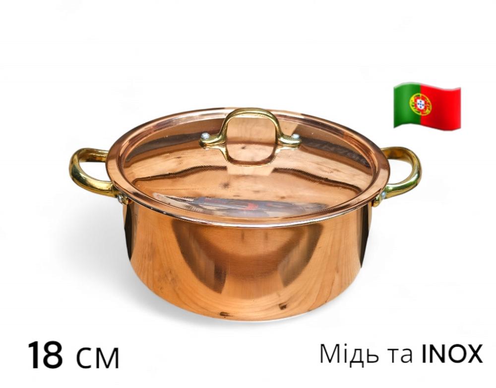 Каструля мідна 18 см (2 л) з нержавіючим покриттям INOX, руків`я - латунь, з кришкою, AV Filhos