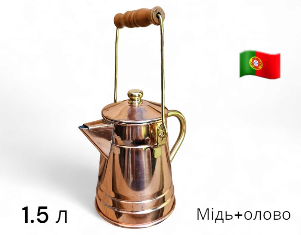 Кавовниця мідна на 1,5л, з носиком, олов`яна середина, має дерев`яну ручку з латунним руків`ям, AV Filhos (65.20.040.3)