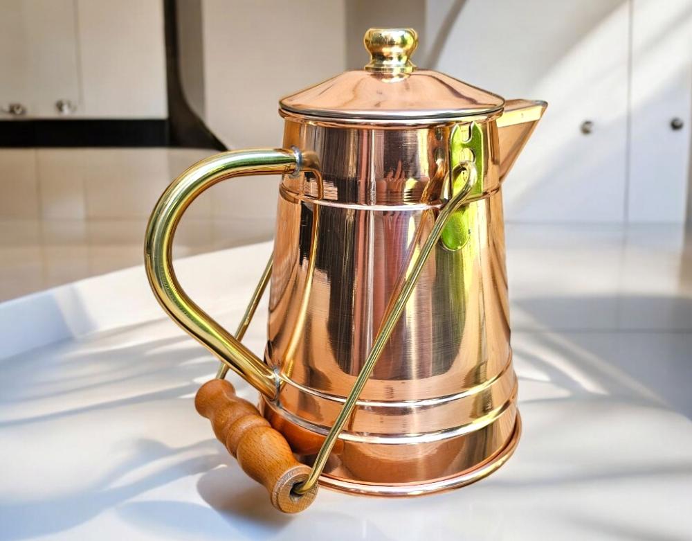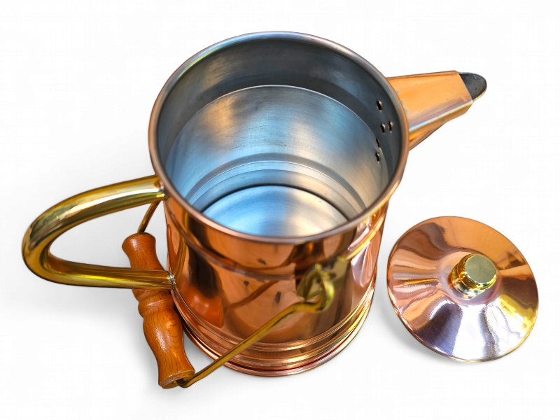 - Зовнішня частина: Виготовлена з високоякісної міді, яка добре проводить тепло, забезпечуючи рівномірний і контрольований процес нагрівання рідини. Мідь також додає естетичної цінності виробу завдяки своєму блискучому та стильному вигляду.