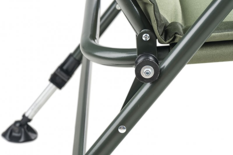 >Положення спинки можна відрегулювати, піднявши підлокітники та нахиливши спинку в потрібне положення. Наматрацник виготовлений із міцного нейлону P-POL 600D, який легко прати. Крісло оснащене новими замками для ніг, ексклюзивно розробленими Mivardi. За допомогою важеля блокування можна наступити або просто натиснути рукою.