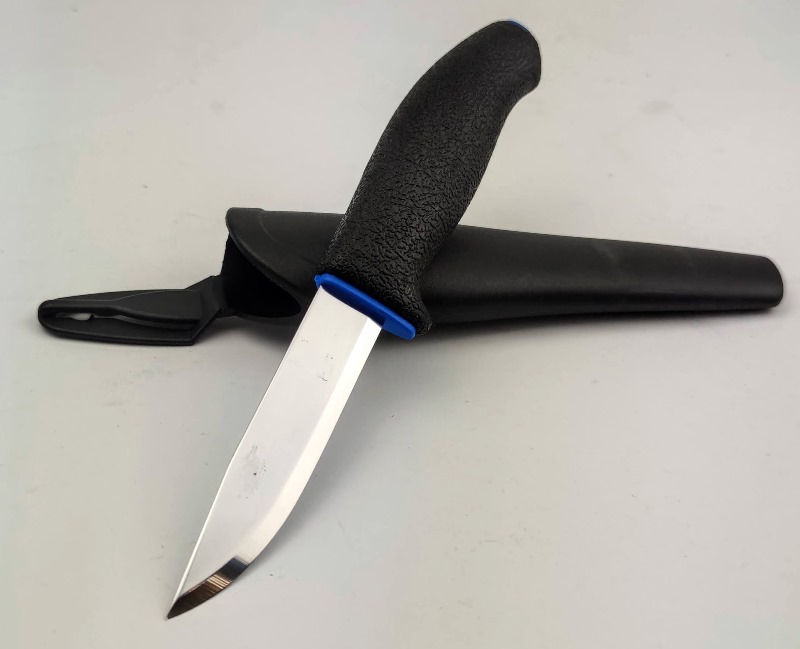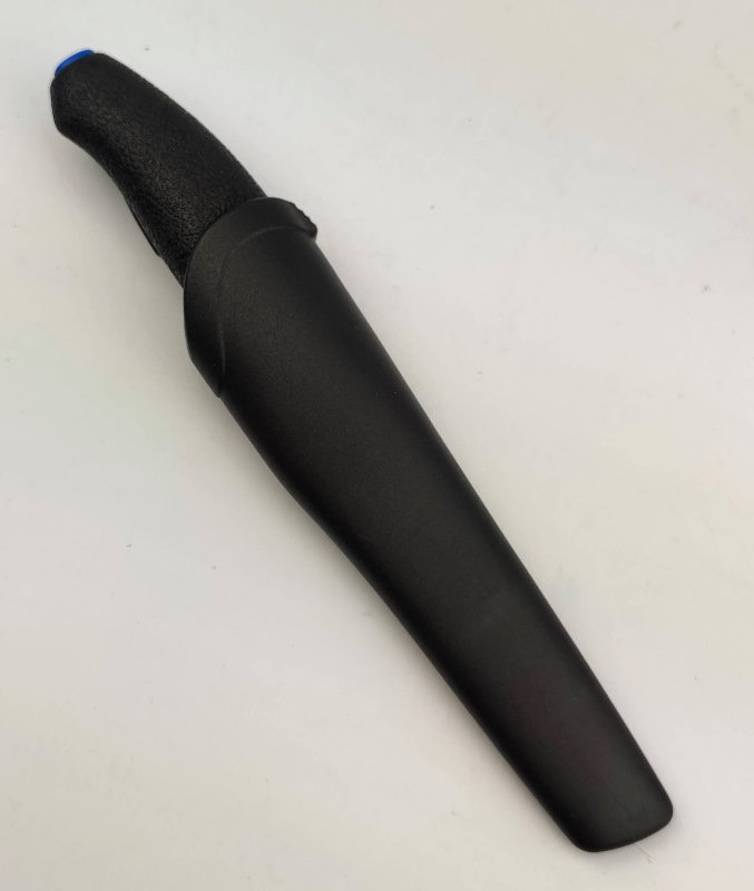 Рукоятка цієї моделі ножа виконана з чорного гумового пластику, завдяки чому ніж можна зручно утримувати навіть мокрою або жирною рукою. Стильні піхви дозволять носити такий ніж на ремені чи одязі.