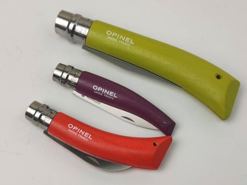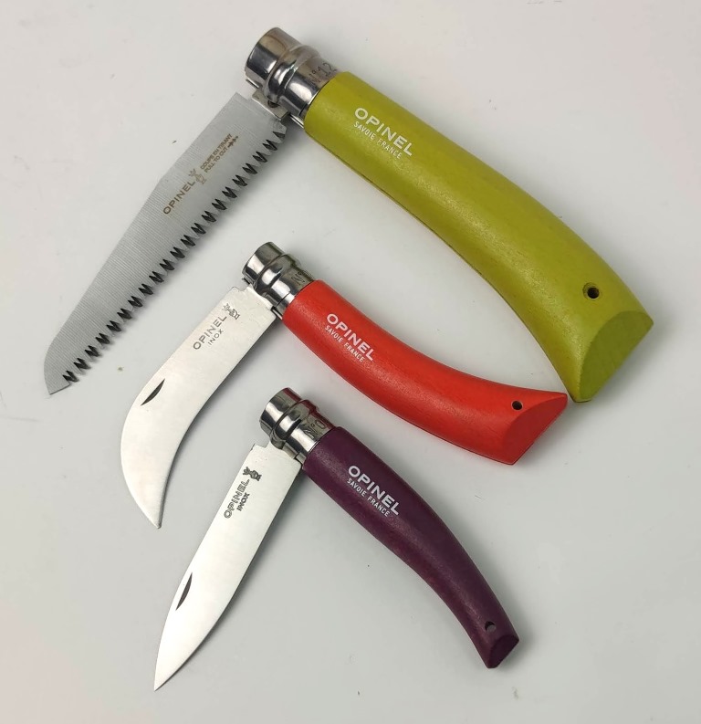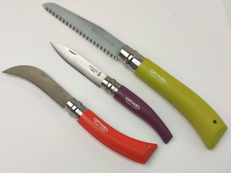 Набір з трьох спеціальних складних інструментів Opinel. У набір входять два кольорові ножі: садовий ніж, серповидний ніж і кольорова пилка. . Їхні леза забезпечують дуже хороші ріжучі властивості. Лезо з глибоким профілем забезпечує чудові можливості серповидного ножа.