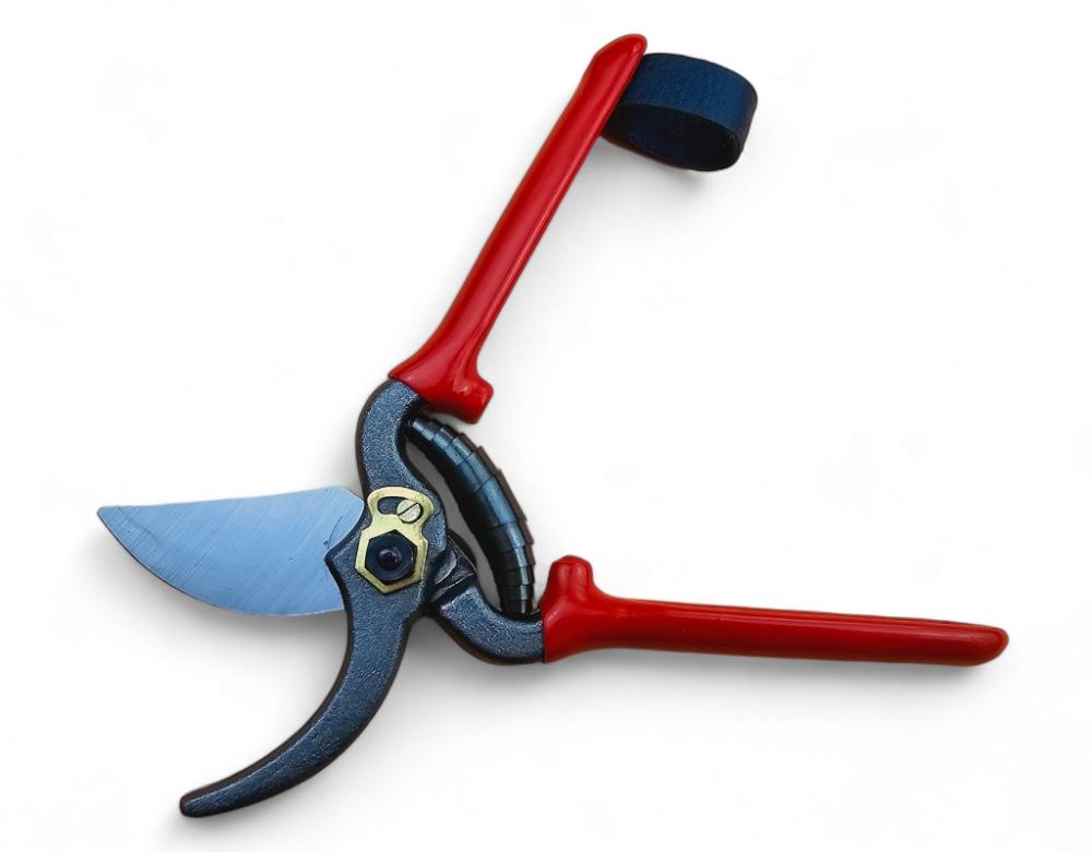 Традиційні секатор з кованої сталі, які гарантують незмінну якість різання та довговічність. Гвинти із загартованої сталі з болт-блоком, сталеві ручки з протиковзким покриттям, в закритому положені фіксується за допомогою шкіряної петельки.