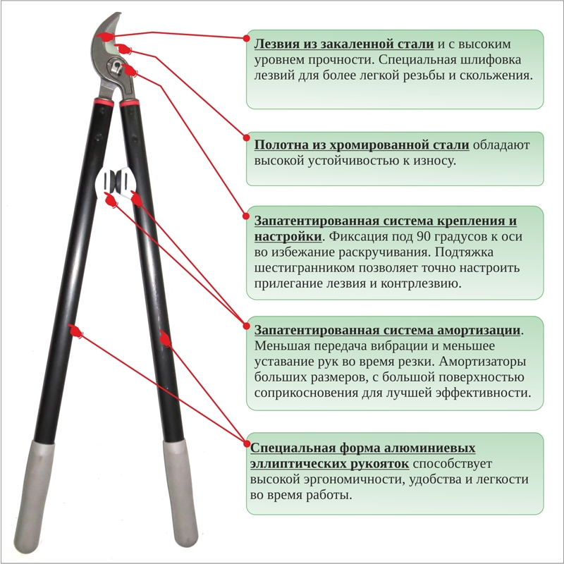 Використовується для обрізання гілок плодових дерев, чагарників та винограду. Діаметр зрізу до 35 мм. Леза сучкоріза з хром-ванадієвої сталі забезпечують тривалу стійкість до зношування та чистого зрізу.