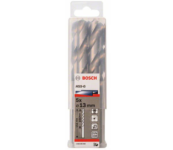 Свердло по металу Bosch HSS-G для легованої та нелегованої сталі з межею міцності при розтягуванні до 900 Н/мм², сталевого лиття, сірого чавуну , металокерамічного сплаву на основі заліза, ковкого чавуну, кольорового металу, твердих пластмас.