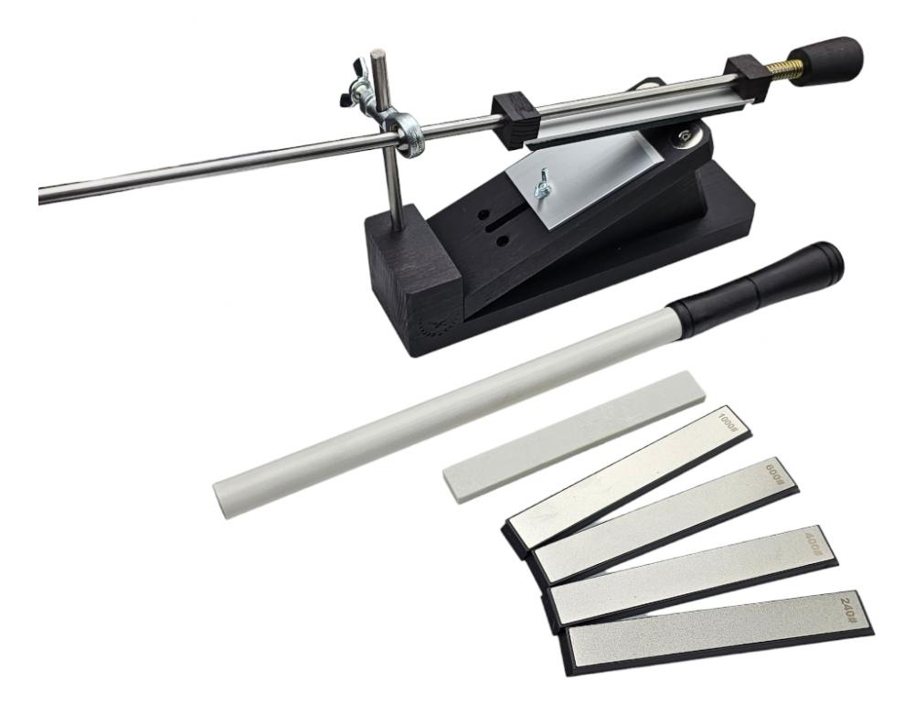 Купити в кредитТочилка настільна Преміум з магнітом утримання ножа, колір "Палісандр". Лімітована серія. Комплектується мусатом профі 290 мм робоча довжина (2500 гріт) + (алмази 240,400,600,1000 та камінь природний 1500+шкіра)