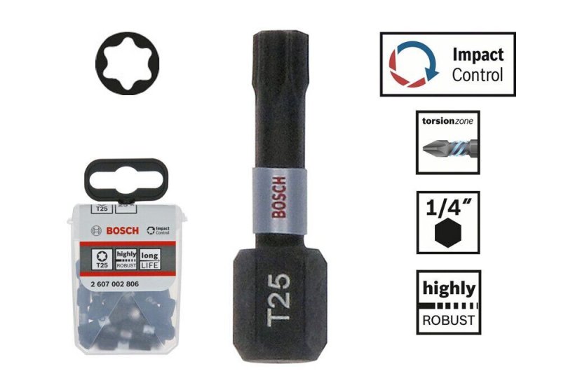Купить в кредитБита Bosch Impact Control «Torx» T25x25 мм (10 шт.) (2607002806) – высокая прочность. Биту Impact Control «Torx» есть возможность использовать в ударном гайковерте.