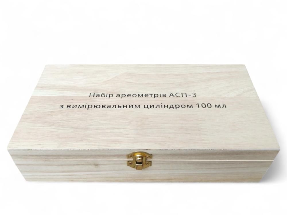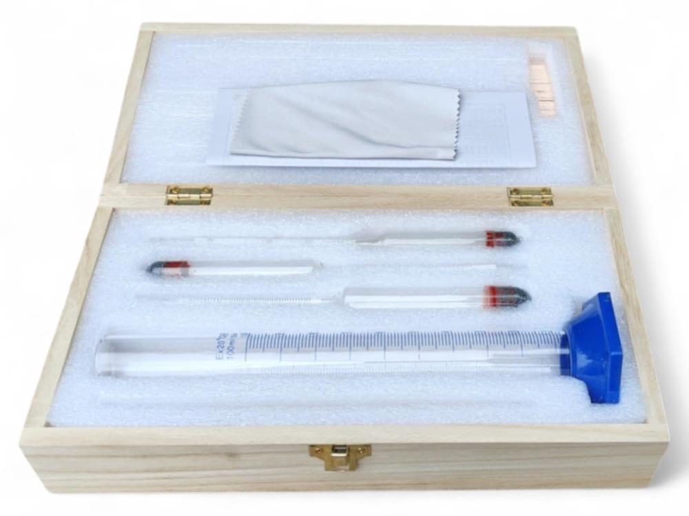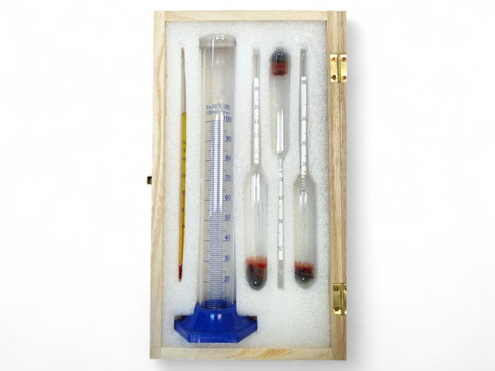 Набор ареометров (3 шт) в деревянном футляре АСП-3 (0-40,40-70,70-100) + спиртовой термометр 0-50 цельсия + мерный цилиндр 100 мл стеклянный