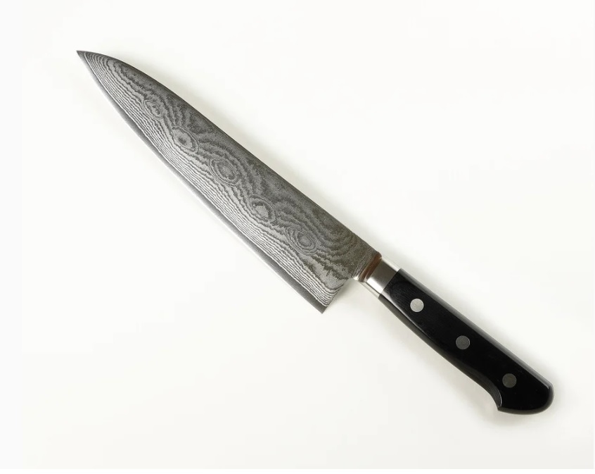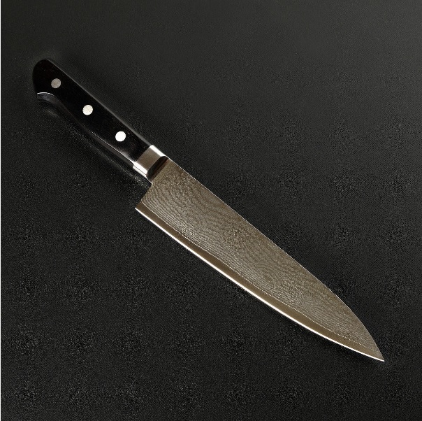Нож кухонный Gyuto (Шефский) 210 мм лезвие, сделанный из нескольких слоев VG10 из кованой нержавеющей стали. Имеет жесткость 61HRC Устойчивый к ржавчине. Хорошо подходит для кухни. Также хорош для приготовления рыбы в домашних условиях.
