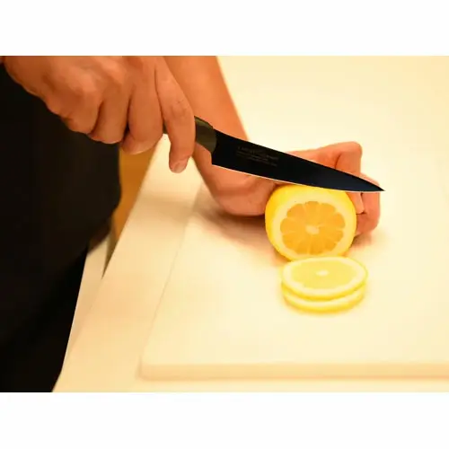 Лезвие с титановым покрытием изготовлено из кованой вручную молибден-ванадиевой стали. Благодаря этому нож очень долго сохраняет первоначальную остроту. Титановое покрытие нетоксичное, химически и кислотостойкое. Он характеризуется значительно большей устойчивостью к истиранию, чем сама сталь. Нож имеет удобную полипропиленовую ручку, устойчивую к температуре до 90℃.