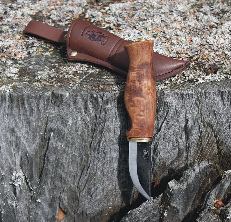 Ahti Kaira - короткий традиционный финский нож. Каждый нож Ahti создан вручную в городе Каухава мастером Reino Kamppila и его сыном Janne. Нож Ahti Kaira выполнен из высокоуглеродистой стали с добавлением ванадия (CO-83, Mn-0.57, VO-20, Cr-0.60). Рукоять из термически обработанной карельской березы. Финский нож Ahti Kaira комплектуется кожаными ножнами.
