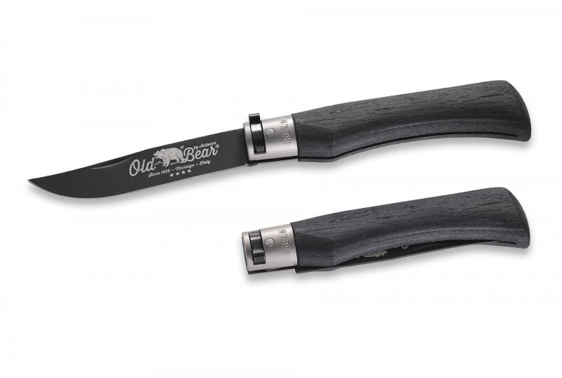 Рукоять изготовлена из стабилизированной древесины – высококачественного ламинированного дерева, влагостойкого и не склонного к растрескиванию. Серию отличает черный оригинальный дизайн рукояти и черное же тефлоновое обработка лезвия. Выглядит брутально! Замок может быть как черный так и светлый. Рукоять сужается к середине, обеспечивая надежное и комфортное удержание ножа в руке. Дополнительную прочность рукояти придает больстер из латуни. Раскладывается нож при помощи ногтевой выемки на клинке.