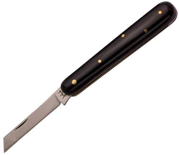 Нож для копулировки Due Buoi, лезвие угловатой формы для различной прививки черенком. Накладки рукоятки из роговой кости будут служить десятилетия. Острие лезвия плавно сведено, отсутствует заводская фаска. Это позволяет доводить остроту лезвие на ремне до остроты бритья. Сталь лезвие отлично держит заточку, до 250 срезов черенков без подводки.