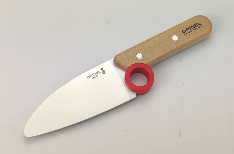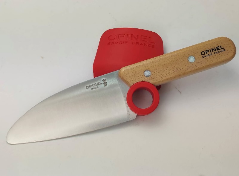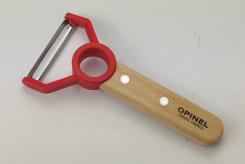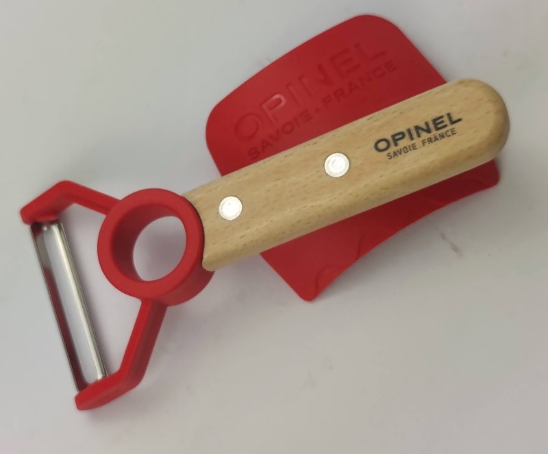 Нож Опинель, состоит из скрэба и ограждения. Лезвие из нержавеющей стали, длиною 10 см. Твердость стали 57 HRC. Эта твердость обеспечивает хорошую заточку ножа, и поэтому им легко резать любые продукты на кухне. Ручка ножа изготовлена из прочного бука. Лезвие плотно встроено в ручку, которая удобно помещается в руке.