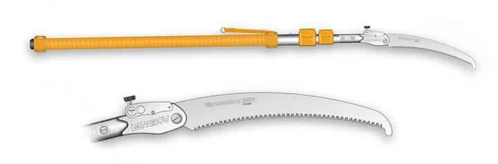 Пила Silky состоит из телескопической штанги (1450 мм - 3600 мм) состоящей из двух секций, которые фиксируются с помощью запатентованой двойной системы фиксации Silky для обеспечения максимальной надежности пиления.