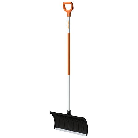 Черенок соединен с рабочим полотном под эффективным углом, что снижает нагрузку на спину. Совок инструмента изготовлен из прочного полипропилена и имеет ребристую форму. Благодаря этому снег не налипает на поверхность ковша. Для большей жесткости рабочего элемента на нем имеется стальная кромка, позволяющая без проблем соскребать лед и снег. Также стоит отметить, что черенок лопаты оснащен специальными накладками, предотвращающими соскальзывание рук.