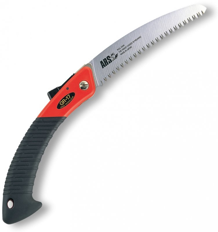 Складная садовая пила ARS GR-17. Она проста и удобна в использовании. Функцию открытия и закрытия лезвия выполняет специальная удобная кнопка. Для надежного захвата служит изогнутый дизайн ручки с нескользящим резиновым покрытием.