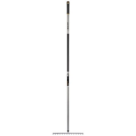 Зубья орудия выполнены из стали высокой марки и покрыты антикоррозийным веществом. Изделие прекрасно противостоит нагрузкам и не боится влаги. Алюминиевый черенок имеет прорезиненные накладки для удобства использования. При этом рукоять и насадка граблей Fiskars Ergonomic™ надежно соединены сварным швом.