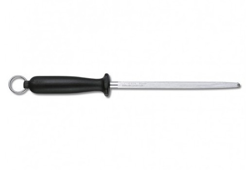Модель Викторинокс имеет круглую правящую зону длиной 20 см, выполненную из стального абразива со средней насечкой. Обеспечивает более экономную правку режущей кромки ножей с гораздо меньшим расходом материала клинка. Удобную фиксацию в руке гарантирует эргономичная рукоять из прочного черного пластика. На торцевой части ручка оборудована стальным кольцом, с помощью которого можно подвесить мусат на кухонной панели инструментов. Благодаря мусату Вы с легкостью устраните возможные искривления на клинке.
